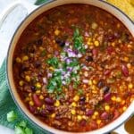 Absolutely! Swap the ground beef for extra beans, diced mushrooms, or lentils. You can also use vegetable broth instead of beef broth. Adding a bit more chili powder and cumin will help keep it bursting with flavor.