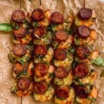 Delicious herb grilled shrimp and chorizo skewers marinated in a fresh basil and cilantro herb oil, grilled to tender juicy perfection. Perfect for summer grilling, these skewers combine the smoky spice of Spanish chorizo with succulent shrimp, topped with a zesty lime finish.