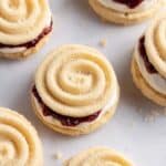 Whip together the softened butter and icing sugar with vanilla extract until it’s light and fluffy. This buttercream is the perfect creamy partner for the buttery biscuits. Spread or pipe a generous dollop on the flat side of one biscuit and top it with a teaspoon of your favorite jam, then sandwich with another biscuit swirl. Repeat until you’ve assembled all your whirls. The first time I made these, I thought “maybe I’m being generous,” but my family went crazy for how much filling I added, so be generous!