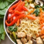 I’ve frozen this recipe successfully, but because of the noodles and veggies, texture can soften slightly once thawed. If freezing, pack single servings and thaw overnight in the fridge before reheating to retain the best quality.