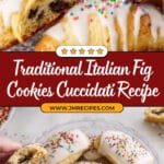Cuccidati are traditional Italian fig cookies featuring a soft, sweet dough filled with a flavorful blend of dried figs, walnuts, dates, orange zest, and Marsala wine. These festive cookies are topped with powdered sugar glaze and colorful nonpareils, making them an irresistible treat perfect for holidays or any special occasion.