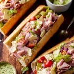 This Chopped Sandwich is a flavorful Italian-inspired meal featuring a medley of chopped deli meats, provolone cheese, and fresh vegetables tossed in a tangy pesto mayo dressing, all served on toasted ciabatta rolls for a satisfying and easy-to-assemble lunch or dinner option.