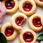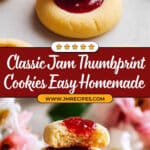 Jam Drops, also known as Thumbprint Cookies, are buttery vanilla shortbread biscuits filled with your choice of jam. These classic cookies are made by pressing your thumb into the dough to create an indentation filled with jam before baking, ensuring the jam is baked into the cookie for a perfect blend of buttery and fruity flavors.