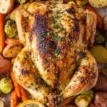 This Spatchcock Chicken recipe delivers a perfectly roasted whole chicken that is juicy and flavorful from a garlic herb butter, accompanied by roasted red potatoes, carrots, and Brussels sprouts. Flattening the chicken ensures even cooking and crispy skin, making this one-pan meal both simple and delicious.
