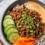 Quick and flavorful Korean Beef Rice Bowls featuring savory ground beef cooked in a rich gochujang soy sauce, served over fluffy jasmine rice with tangy kimchi, fresh vegetables, and drizzled with a creamy gochujang mayo. This easy weeknight meal is packed with bold Korean flavors and customizable toppings, perfect for a satisfying dinner.