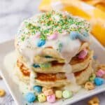 Delight in a whimsical breakfast treat with these Lucky Charms Pancakes, combining fluffy pancake batter with colorful Lucky Charms cereal and a touch of white chocolate for extra sweetness. Perfect for a fun and festive morning, these pancakes are easy to make and bring a playful twist to your breakfast table.