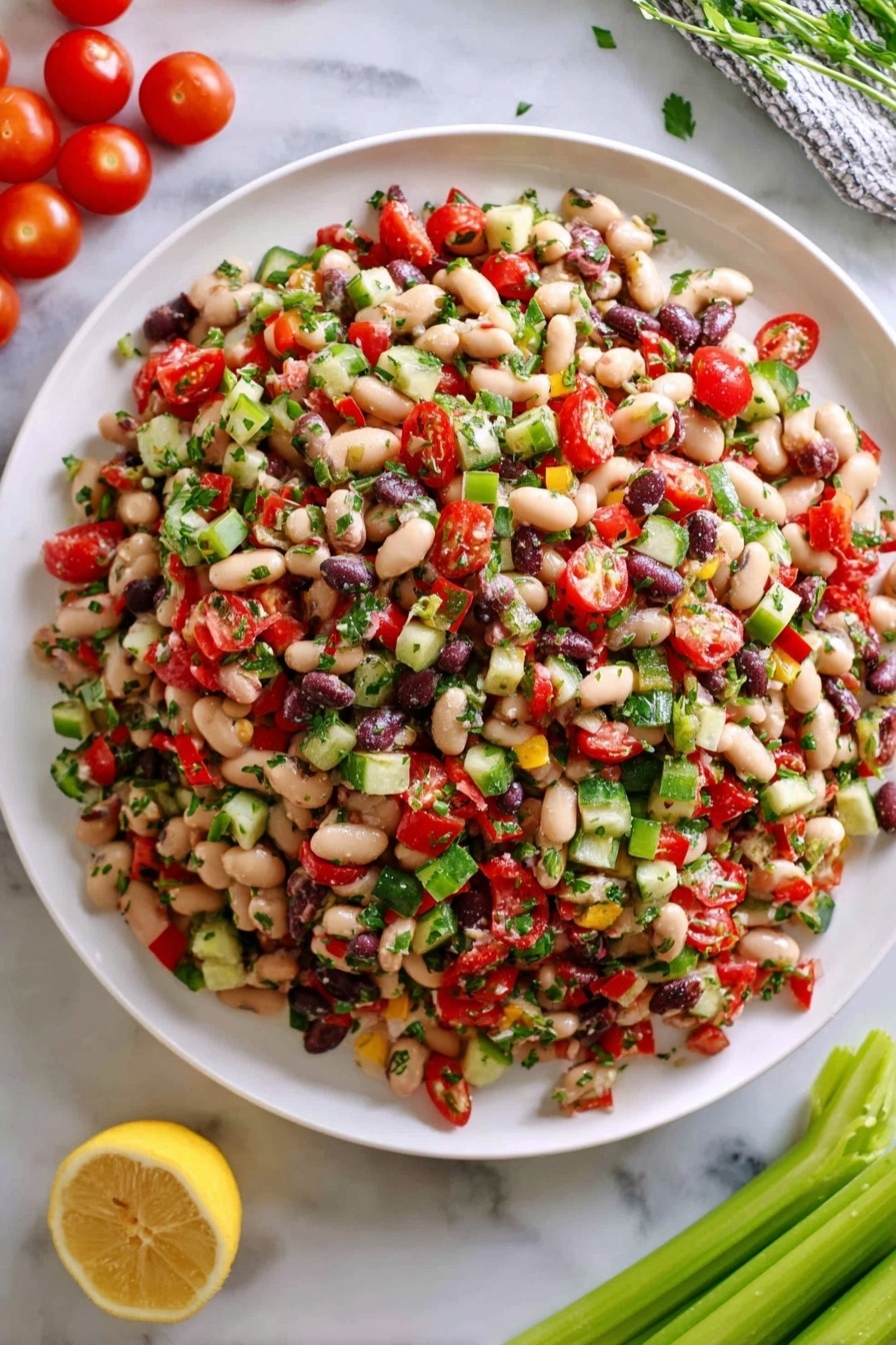 Drain and rinse your canned chickpeas, black beans, and cannellini beans thoroughly. This step is key to reducing that canned flavor you sometimes get. Add the beans into the bowl with your dressing and toss everything together so they soak up the vibrant, tangy dressing. I usually let this marinate while I get the veggies ready—that way, the flavors mingle nicely by the time we’re done chopping.