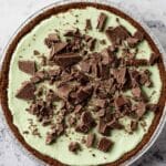 Grasshopper Pie is a deliciously creamy and minty no-bake dessert featuring a smooth cream cheese and sweetened condensed milk filling mixed with chocolate-covered mint cookies. Set in a chocolate crumb crust and finished with whipped topping and additional cookie garnish, this refreshing pie is perfect for any occasion and can be made ahead and frozen overnight.