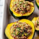 For holiday dinners or special occasions, I like to arrange these stuffed acorn squash halves on a rustic wooden board lined with fresh herbs and pomegranate seeds for an unexpected pop of color and festive vibe. It’s such an inviting centerpiece and the squash “bowls” make it easy for guests to serve themselves.