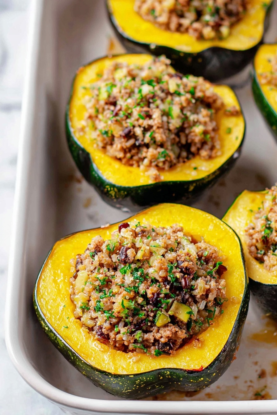Start by preheating your oven to 400°F (200°C). Halve your acorn squashes and scoop out the seeds—don’t toss the seeds, by the way, they’re great roasted like pumpkin seeds! Place the squash halves cut side down in a baking dish—this helps them steam and soften evenly without drying out. After about 35 to 40 minutes, the squash will be tender when pierced with a fork but still hold its shape perfectly, creating a natural “bowl” for that flavorful filling. This roasting step really brings out the nutty sweetness of the squash, which balances beautifully with the savory spices later.