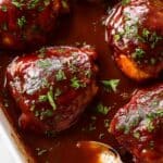 This Oven Baked BBQ Chicken recipe features juicy chicken thighs coated in a quick homemade barbecue sauce, baked to perfection, then broiled to create a delicious sticky glaze. Easy to make in the oven without needing a grill, the chicken is tender, flavorful, and perfect for a comforting meal.