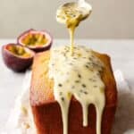 - Finish and Serve: Once the cake has cooled, carefully unmold by lifting the parchment paper. Place the cake on a serving plate and drizzle the passion fruit icing evenly on top. Garnish with extra passion fruit seeds if desired. Serve at room temperature, optionally accompanied by whipped cream or ice cream.