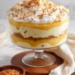 A luxurious Passionfruit Trifle featuring layers of boozy ladyfingers soaked in cachaça, rum, or pisco, passionfruit curd, creamy coconut and passionfruit pudding, and topped with whipped cream. This vibrant dessert balances tart passionfruit flavors with rich coconut and creamy textures, perfect for special occasions or a summery treat.