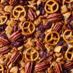 A crunchy and flavorful Pecan Pumpkin Spice Snack Mix featuring gluten-free vegan pretzels, cornflakes, pecans, and a blend of autumn-inspired spices, sweetened with maple syrup and finished with tart dried cranberries. Perfect for a seasonal snack or festive gathering.