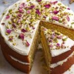 Persian Love Cake is a fragrant and tender almond cake infused with cardamom, lemon zest, rosewater, and vanilla. This moist cake is layered with a tangy lemon glaze and beautifully topped with crushed pistachios and dried rose petals, making it a perfect elegant dessert for special occasions or afternoon tea.