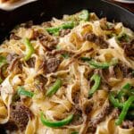 Philly Cheesesteak Pasta combines tender strips of steak, sautéed onions and green bell peppers, and a creamy, cheesy sauce tossed with pappardelle pasta. This hearty dish brings the flavors of a classic Philly cheesesteak into a comforting pasta meal perfect for a quick weeknight dinner.