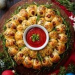- Garnish and Serve: Optionally, tuck fresh Rosemary sprigs around the wreath for a festive look. Place a bowl of ketchup or your preferred dipping sauce in the center of the wreath and serve warm.