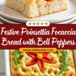 Poinsettia Focaccia Bread is a festive and visually stunning savory bread, decorated with red bell peppers and yellow cherry tomatoes to resemble poinsettia flowers. It’s a simple, yet impressive holiday treat perfect for sharing, featuring a fragrant rosemary flavor and a soft, airy texture.