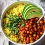 Mama’s Chickpea in Sofrito with Arroz con Gandules is a comforting Puerto Rican-inspired vegetarian dish featuring protein-packed chickpeas simmered in a flavorful sofrito sauce paired with traditional rice and pigeon peas. This vegan and easy-to-make meal is perfect for wholesome dinners and meal prep.