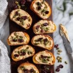 4. Assemble the Crostini: Generously spread the pumpkin cheese mixture over each toasted baguette slice. Top each with a combination of dried cranberries, toasted pumpkin seeds, and chopped fresh sage to add flavor and texture.