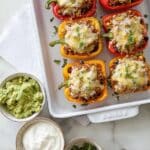 - Garnish and Serve: Remove from oven and garnish with guacamole, sour cream, sliced green onions, cilantro, and finely chopped red onions. Serve warm.