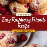 Delight in these easy Raspberry Friands, tender almond-flavored mini cakes bursting with fresh raspberries. Made without a mixer in a simple muffin tin method, these friands feature a light, moist crumb with a golden crust, perfect for breakfast or a sweet snack. The recipe uses egg whites and almond meal for a delicate texture, and the batter is topped with juicy raspberries inside and out. Dust with powdered sugar for an elegant finish.
