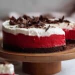 This Red Velvet Cheesecake is a stunning no-bake dessert that combines the bold, striking color and flavor of classic red velvet cake with the rich, creamy decadence of cheesecake. The filling is a beautifully chocolatey blend that is rich yet light with a velvety texture that melts in your mouth. Perfect for impressing guests, this cheesecake features a crunchy Oreo cookie base and a luscious red velvet cream cheese filling topped with whipped cream and optional dark chocolate shavings.