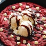 This Red Velvet Skillet Cookie is a thick, chewy deep-dish cookie baked in a cast iron skillet, featuring a vibrant red velvet flavor and studded with creamy white chocolate chips. Perfectly paired with ice cream and hot fudge, it’s a delightful dessert for sharing warm with family and friends.