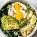 A light and nourishing Savory Quinoa Breakfast Bowl featuring fluffy quinoa, sautéed kale, creamy avocado, soft boiled eggs, and dairy-free pesto. This recipe offers a perfect balance of protein, fiber, and healthy fats, making it an ideal meal prep-friendly breakfast.