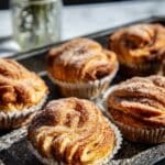 - Slice and Shape: Cut the pastry log into 6-8 slices and place each round into the prepared cupcake liners. Repeat the process using the remaining pastry sheets and apples. Gently press each round down with your palm to flatten them to about half their original thickness. Lightly sprinkle remaining cinnamon sugar over the tops.