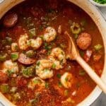 Shrimp and Sausage Gumbo is a hearty and flavorful Cajun stew featuring a rich, golden-brown roux base, tender sausage, succulent shrimp, and aromatic vegetables simmered together to create a delicious one-pot meal perfect for any occasion.