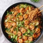 You can prep veggies and sauce ahead to save time. Just keep the shrimp and noodles separate until you’re ready to stir-fry and combine everything for the freshest results.