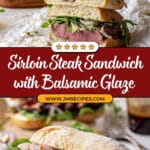 This Sirloin Steak Sandwich is a flavorful and elegant meal featuring perfectly seared sirloin steak, creamy mayo-Dijon spread, peppery arugula, and tangy balsamic glaze all layered on toasted ciabatta rolls for a delightful combination of textures and tastes.