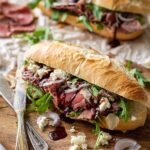 This Sirloin Steak Sandwich is a flavorful and elegant meal featuring perfectly seared sirloin steak, creamy mayo-Dijon spread, peppery arugula, and tangy balsamic glaze all layered on toasted ciabatta rolls for a delightful combination of textures and tastes.