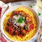 I’ve frozen this Chicken Cacciatore a few times with great results. Portion it into freezer-safe containers before cooking pasta, and it will last up to 3 months. When you’re ready to enjoy, thaw overnight in the fridge before reheating gently on the stove or in the slow cooker to preserve texture.
