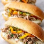 These Slow Cooker Italian Chicken Sandwiches feature tender, flavorful chicken thighs slow-cooked with pepperoncini, giardiniera, and classic Italian seasonings. The chicken is browned for extra depth before slow cooking to develop rich, savory layers of flavor. Served on toasted hoagie buns with melted provolone cheese, extra pepperoncini, and giardiniera, these sandwiches are perfect for a hearty weeknight dinner or game day meal bursting with spicy, tangy goodness.