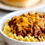 - Assemble Bake: In a baking dish, layer half of the noodle mixture evenly on the bottom. Spoon and spread half of the meat sauce over the noodles. Sprinkle half of the grated sharp cheddar cheese atop the meat layer. Repeat with remaining noodles, meat sauce, and finish by sprinkling the last of the cheddar cheese over the top.