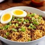 Spicy Beef Ramen is a flavorful twist on classic ramen noodles, featuring a savory ground beef mixture infused with chili garlic sauce and crushed red pepper for a spicy kick. Topped with soft boiled eggs, sesame seeds, and green onions, this hearty dish combines tender noodles with bold, aromatic flavors for an easy and satisfying meal.