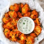 - Serve: Serve the buffalo cauliflower bites hot, accompanied by ranch or blue cheese dressing and fresh carrots and celery sticks for a perfect spicy and cooling contrast.