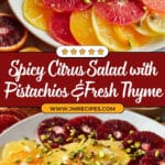 A vibrant and refreshing spicy citrus salad featuring a mix of citrus fruits, Vidalia onion, pistachios, and fragrant thyme, tossed with lime juice, fruity olive oil, and a hint of smoked paprika or cayenne for a zesty kick. Perfect as a light appetizer or side dish, this salad balances sweet, tangy, and spicy flavors with crunchy textures.