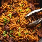 To the same pan (no need to clean it), toss in sliced onions, mushrooms, the ramen noodles, seasoning packets, and the marinade left in the bag. Pour in about 1½ cups of water and bring everything to a simmer. This step infuses the noodles with all the savory-goodness leftover from cooking the steak. Cook for 5-7 minutes or until the noodles are tender but still have a slight chew—because nobody wants mushy noodles!