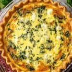 This Spinach Feta Quiche features a flaky pie crust filled with sautéed onions and fresh spinach, combined with a creamy mixture of eggs, half & half, and seasoned with salt, pepper, and nutmeg. Topped with crumbled feta and shredded white cheddar cheese, this savory quiche bakes to a golden perfection, making it an ideal dish for brunch, breakfast, or casual meals.