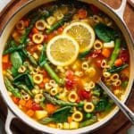A vibrant and hearty Spring Minestrone Soup featuring fresh seasonal vegetables, beans, and herbs simmered in a flavorful vegetable broth, perfect for a nourishing and comforting meal during the spring season.