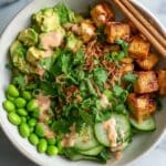 This Sticky Glazed Tofu Bowl with Yum Yum Sauce is a vibrant, protein-packed vegan meal bursting with flavor and texture. Featuring extra firm tofu coated in a sweet and savory glaze, served over warm sushi or jasmine rice, and topped with fresh edamame, cucumber, avocado, crispy onions, cilantro, and scallions, all drizzled with a creamy, tangy vegan Yum Yum sauce. This gluten-free and satisfying bowl is perfect for a wholesome lunch or dinner.