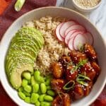 - Assemble the dish: Start with a serving of hot cooked white rice. Top with the sticky chicken and pineapple mixture. Add cooked edamame beans, sliced radishes, avocado slices, spring onion, and sprinkle sesame seeds over the top for garnish.