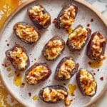 Stuffed dates store beautifully in an airtight container in the fridge for up to 3 days. I recommend assembling them fresh, but if you need to prep ahead, stuff the dates and drizzle honey just before serving to maintain that lovely texture and shine.