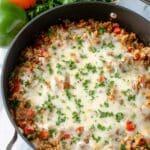This Stuffed Pepper Skillet offers all the delicious flavors of traditional stuffed peppers in a quick and easy one-pan meal. Ground beef, bell peppers, rice, and savory seasonings are cooked together in a skillet, then topped with melted pepper jack and cheddar cheese for a comforting and satisfying dish ready in just 30 minutes.