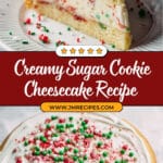 - This sugar cookie cheesecake combines a buttery shortbread crust, creamy vanilla cheesecake filling with sugar cookie dough bites, and a sour cream frosting topped with sprinkles for a festive touch.