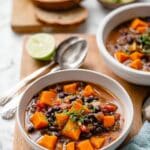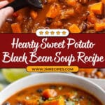 A hearty and healthy Sweet Potato Black Bean Soup, brimming with flavors of garlic, ginger, cumin, and paprika, finished with a fresh squeeze of lime. This vegan-friendly soup is perfect for warming up on a chilly day and packed with nutritious ingredients for a satisfying meal.