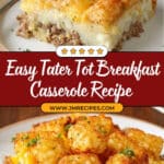 A hearty and comforting Tater Tot Breakfast Casserole featuring layers of crispy tater tots, savory cooked sausage, fluffy eggs, and melted Mexican blend cheese. Perfect for a crowd or a filling family breakfast.